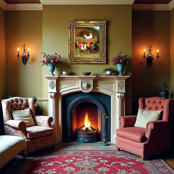 A Fine Oleograph on Stretched Canvas in an Ornate Rococo Frame, depicting a Cockerel & Hens in a Yard. The Oleograph measures 16 inches x 12 inches with overall measurements in the Hand Painted Gesso Gallery frame being 22 inches x 18 inches. The Oleograph has a hand applied varnished finish with replicates the appearance, craquelure, patina & texture of an oil painting.