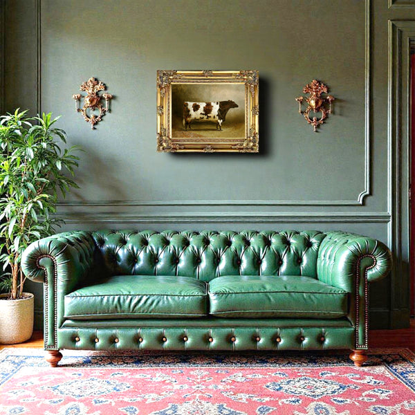 A Fine Oleograph on Stretched Canvas in an Ornate Rococo Frame, depicting a Prize Heifer in a Yard. The Oleograph measures 16 inches x 12 inches with overall measurements in the Hand Painted Gesso Gallery frame being 22 inches x 18 inches. The Oleograph has a hand applied varnished finish with replicates the appearance, craquelure, patina & texture of an oil painting.