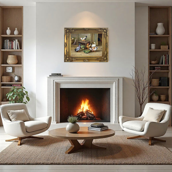 A Fine Oleograph on Stretched Canvas in an Ornate Rococo Frame, Chickens & in a Stable Yard. The Oleograph measures 16 inches x 12 inches with overall measurements in the Hand Painted Gesso Gallery frame being 22 inches x 18 inches. The Oleograph has a hand applied varnished finish with replicates the appearance, craquelure, patina & texture of an oil painting.