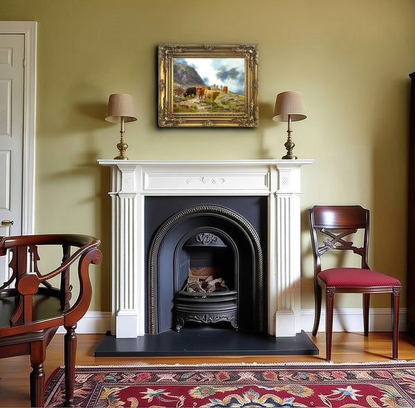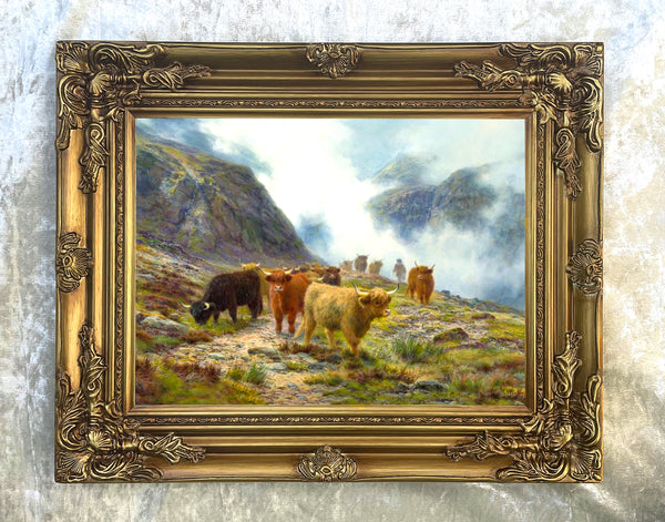 A Fine Oleograph on Stretched Canvas in an Ornate Rococo Frame, depicting Highland Cattle in the Mountains. The Oleograph measures 16 inches x 12 inches with overall measurements in the Hand Painted Gesso Gallery frame being 22 inches x 18 inches. The Oleograph has a hand applied varnished finish with replicates the appearance, craquelure, patina & texture of an oil painting.