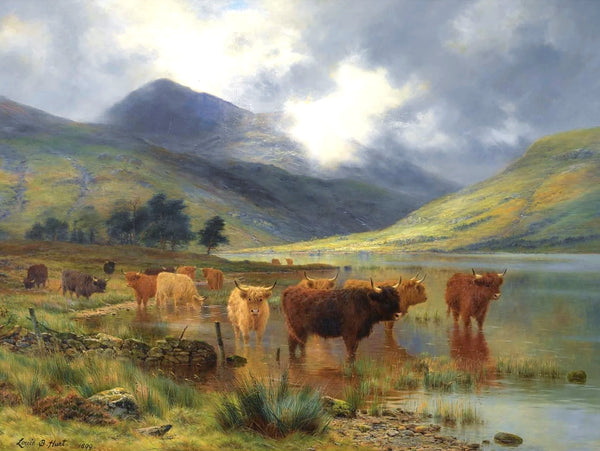 Fine Oleograph on Canvas of Highland Cattle watering by a Loch
