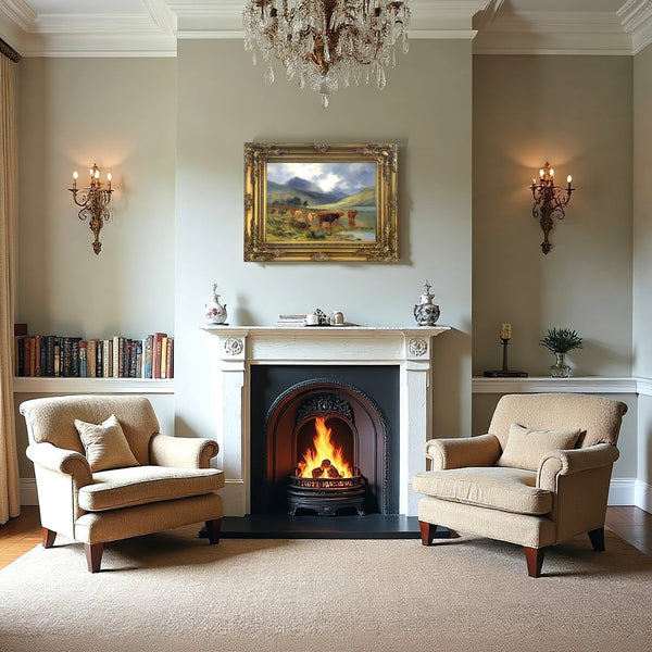 A Fine Oleograph on Stretched Canvas in an Ornate Rococo Frame, depicting Highland Cattle grazing by a Loch. The Oleograph measures 16 inches x 12 inches with overall measurements in the Hand Painted Gesso Gallery frame being 22 inches x 18 inches. The Oleograph has a hand applied varnished finish with replicates the appearance, craquelure, patina & texture of an oil painting.