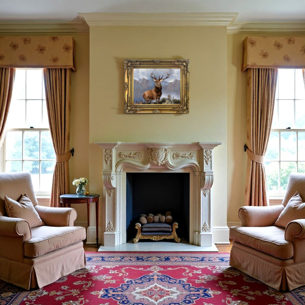 A Fine Oleograph on Stretched Canvas in an Ornate Rococo Frame, "Monarch of the Glen" after the original by Edwin Landseer. The Oleograph measures 16 inches x 12 inches with overall measurements in the Hand Painted Gesso Gallery frame being 22 inches x 18 inches. The Oleograph has a hand applied varnished finish with replicates the appearance, craquelure, patina & texture of an oil painting.