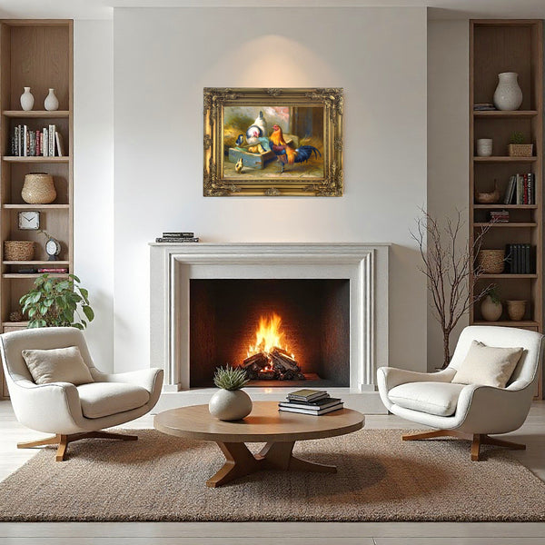 An elegant oleograph on canvas depicting a Family of Chickens in a Stable after the original by Edgar Hunt in a Gilt Gesso Rococo Frame. Measuring 16 inches x 12 inches (22 inches x 18 inches in the frame), the oleograph is handcrafted in Norfolk & has the appearance, patina & texture of an oil painting.