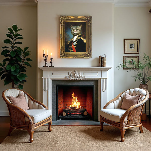 A quirky lithograph on stretched canvas of a character military tabby cat - "A High Ranking Officer" in an ornate gilt gesso frame. The lithograph measures 16 inches by 12 inches and measurements in the frame being 22 inches by 18 inches. The Lithograph has a hand applied varnished finish which replicates the appearance, craquelure, patina & texture of an oil painting. Each Lithograph is a master-piece in its own right and carefully hand-finished to recreate the timeless look and appeal of an original Oil Painting.