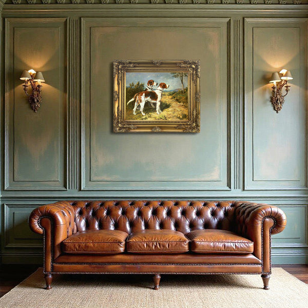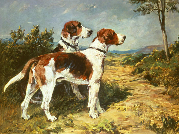 A very fine Lithograph on Canvas depicting Two Foxhounds in a Landscape after the original by John Emms. The Lithograph measures 16 inches x 12 inches & is elegantly framed in an ornate rococo gilt gesso gallery frame with overall measurements being 22 inches x 18 inches. The oleograph has the appearance, patina & texture of an oil painting.