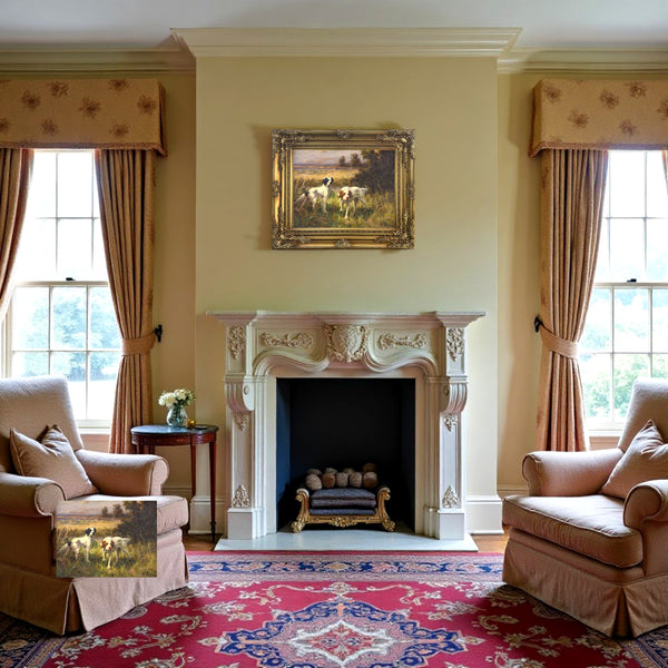 A Very Fine Oleograph on Stretched Canvas in an Ornate Hand Finished Rococo Frame, depicting Setters on the Scent in a Landscape. The oleograph measures at 16 inches x 12 inches with overall measurements in the frame at 22 inches x 18 inches. The Oleograph has the appearance, patina & texture of an oil painting.