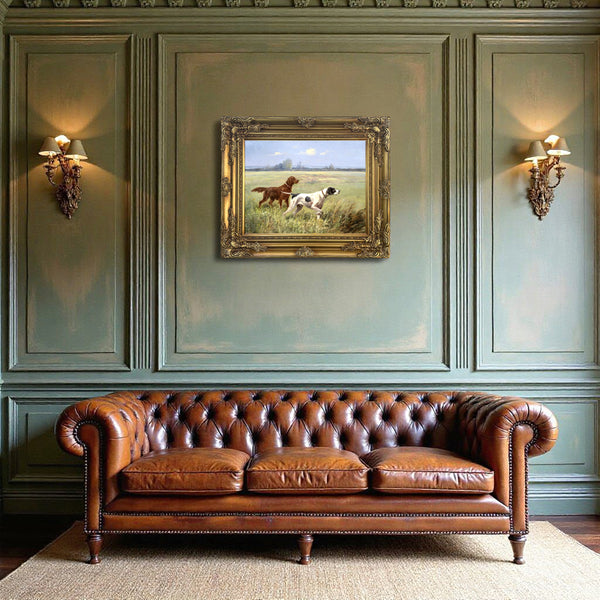 A Very Fine Oleograph on Stretched Canvas in an Ornate Hand Finished Rococo Frame, depicting an English Pointer & Red Setter in a Rural Landscape. The oleograph measures at 16 inches x 12 inches with overall measurements in the frame at 22 inches x 18 inches. The Oleograph has a hand applied varnished finish which replicates the appearance, craquelure, patina & texture of an oil painting. Each Oleograph is a master-piece in its own right and carefully hand-finished to recreate the timeless look and appeal of an original Oil Painting.