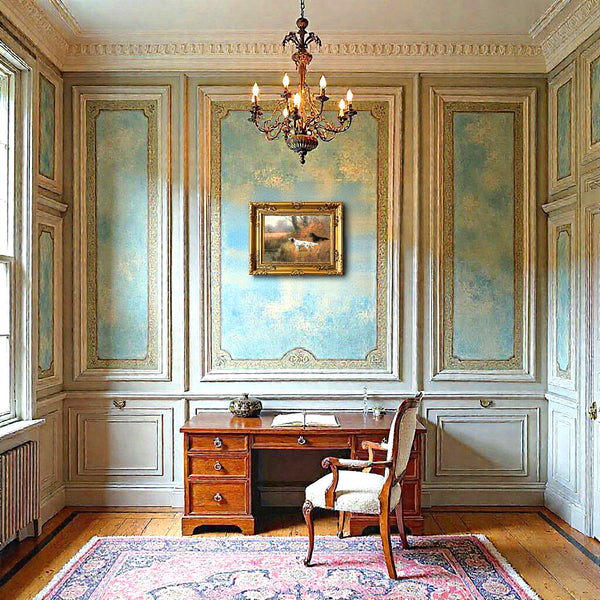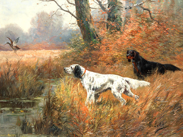 A Very Fine Oleograph on Stretched Canvas in an Ornate Hand Finished Rococo Frame, depicting an English Pointer in a Landscape "On Point". The oleograph measures at 16 inches x 12 inches with overall measurements in the frame being 22 inches x 18 inches. The Oleograph has the appearance, patina & texture of an oil painting.