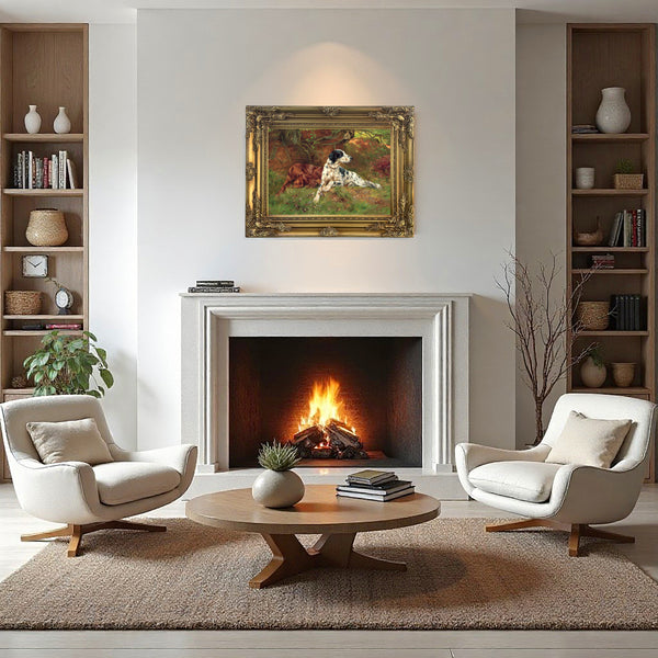 A Very Fine Oleograph on Stretched Canvas in an Ornate Hand Finished Rococo Frame, depicting a pair of English Setters. The oleograph measures at 16 inches x 12 inches with overall measurements in the frame at 22 inches x 18 inches.  The Oleograph has the appearance, patina & texture of an oil painting.
