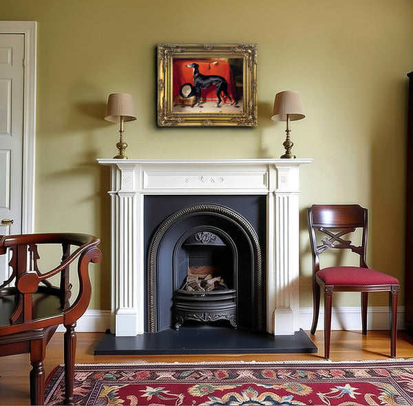 A Very Fine Oleograph on Stretched Canvas in an Ornate Hand Finished Rococo Frame, depicting the Greyhound "Eos" after the original by Edwin Landseer. The oleograph measures 16 inches x 12 inches with overall measurements in the frame being 22 inches x 18 inches. The Oleograph is handcrafted in Norfolk & has the appearance, patina & texture of an oil painting.