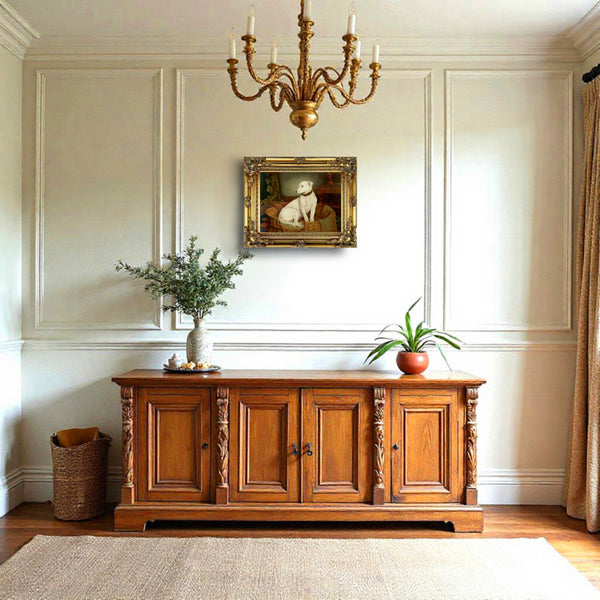 A Very Fine Oleograph on Stretched Canvas in an Ornate Hand Finished Rococo Frame, depicting a Terrier in its Basket after the original by William Woodhouse. The oleograph measures 16 inches x 12 inches with overall measurements in the frame being 22 inches x 18 inches. The Oleograph is handcrafted in Norfolk & has the appearance, patina & texture of an oil painting.