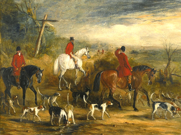 Oleograph on Canvas of Huntsmen & Hounds at a Crossroads