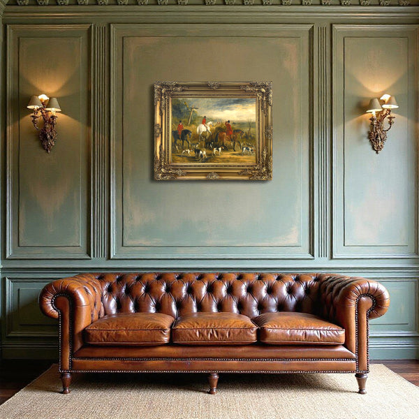 A Superb  Oleograph on Stretched Canvas in an Ornate Rococo Frame, depicting a Hunting Scene - "Huntsmen & Hounds at a Crossroads". The oleograph measures 16 inches x 12 inches with overall measurements in the Hand Painted Gesso Gallery frame being 22 inches x 18 inches.  The oleograph has a hand applied varnished finish with replicates the appearance, craquelure, patina & texture of an oil painting.