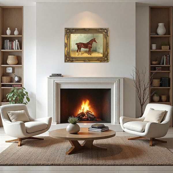 A Very Fine Oleograph on Stretched Canvas in an Ornate Hand Finished Rococo Frame, depicting a Portrait of a Chestnut Horse in a Stable. The Oleograph measures 16 inches x 12 inches with overall measurements in the frame being 22 inches x 18 inches. The Oleograph has the appearance, patina & texture of an oil painting. The Oleograph has a hand applied varnished finish which replicates the appearance, craquelure, patina & texture of an oil painting. Each Oleograph is a master-piece in its own right and carefully hand-finished to recreate the timeless look and appeal of an original Oil Painting.