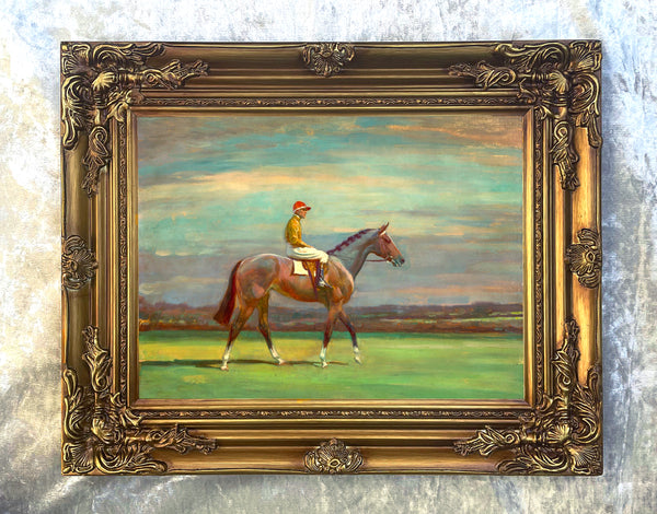 A Fine Lithograph on Stretched Canvas in an Ornate Rococo Frame, depicting a Bay Racehorse with Jockey Up aft. Alfred Munnings. The Lithograph measures 16 inches x 12 inches with overall measurements in the Gilt Gesso Gallery frame at 22 inches x 18 inches. The Lithograph has a hand applied varnished finish with replicates the appearance, craquelure, patina & texture of an oil painting.