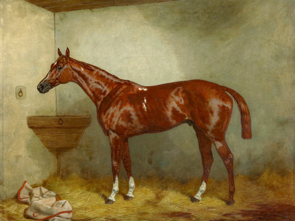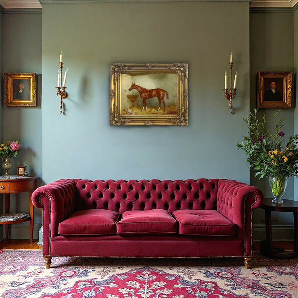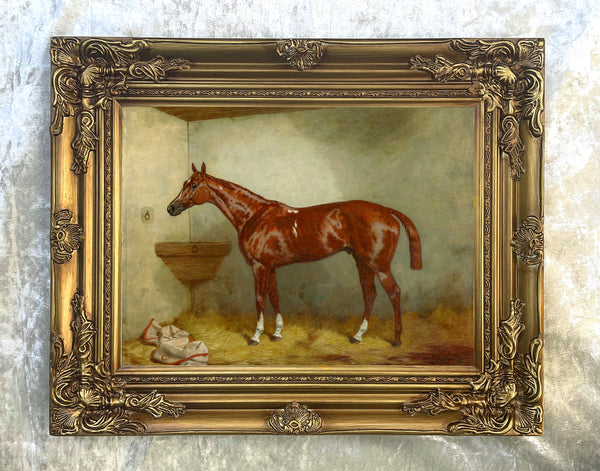 A Fine Oleograph on Stretched Canvas in an Ornate Rococo Frame, depicting a Bay Racehorse in a Loosebox, after the original by Harry Hall. The oleograph measures 16 inches x 12 inches with overall measurements in the Hand Painted Gesso Gallery frame being 22 inches x 18 inches. The oleograph has a hand applied varnished finish with replicates the appearance, craquelure, patina & texture of an oil painting.