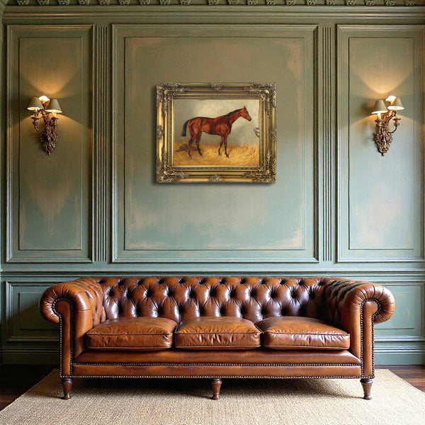 A Superb Oleograph on Stretched Canvas in an Ornate Rococo Frame, depicting a Horse in a Stable after Emil Adam. The oleograph measures 16 inches x 12 inches with overall measurements in the Hand Painted Gesso Gallery frame being 22 inches x 18 inches. The oleograph has a hand applied varnished finish with replicates the appearance, craquelure, patina & texture of an oil painting.