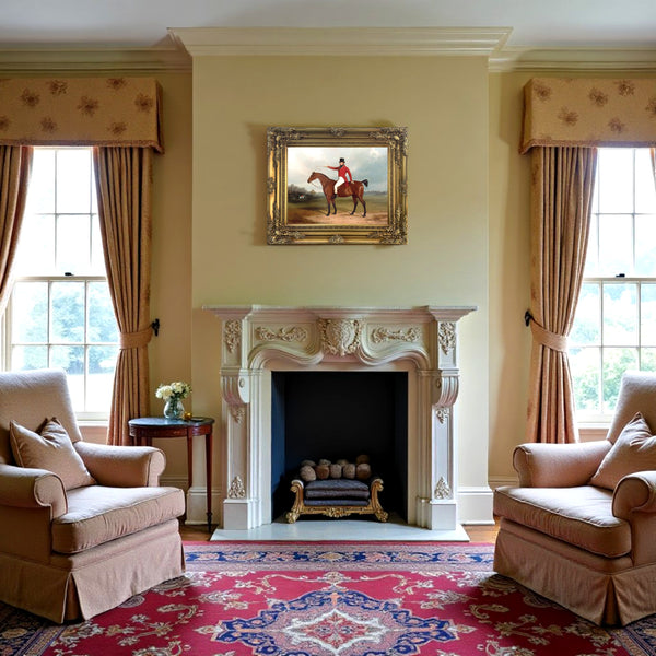 A Superb  Oleograph on Stretched Canvas in an Ornate Rococo Frame, depicting a Huntsman on a Bay Hunter. The oleograph measures 16 inches x 12 inches with overall measurements in the Hand Painted Gesso Gallery frame being 21 inches x 17 inches.  The oleograph has a hand applied varnished finish with replicates the appearance, craquelure, patina & texture of an oil painting.