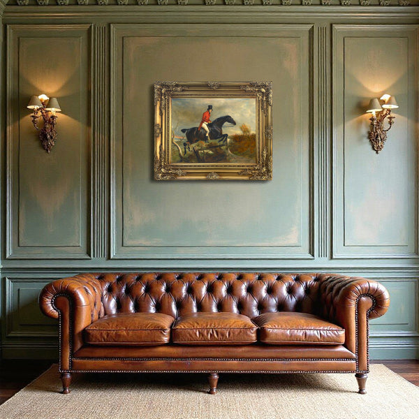 A Fine Oleograph on Stretched Canvas in an Ornate Rococo Frame, depicting a Huntsman Taking a Fence. The oleograph measures 16 inches x 12 inches with overall measurements in the Gilt Gesso Gallery frame being 22 inches x 18 inches. The oleograph has a hand applied varnished finish with replicates the appearance, craquelure, patina & texture of an oil painting.