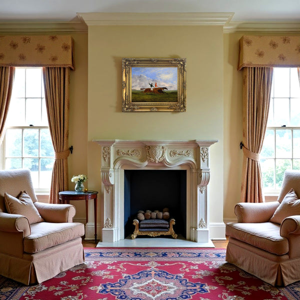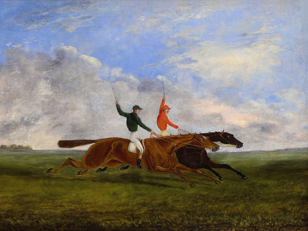 A Superb Oleograph on Stretched Canvas in an Ornate Rococo Frame, depicting Racehorses "A Close Finish". The oleograph measures 16 inches x 12 inches with overall measurements in the Hand Painted Gesso Gallery frame at 22 inches x 18 inches. The oleograph has a hand applied varnished finish with replicates the appearance, craquelure, patina & texture of an oil painting.