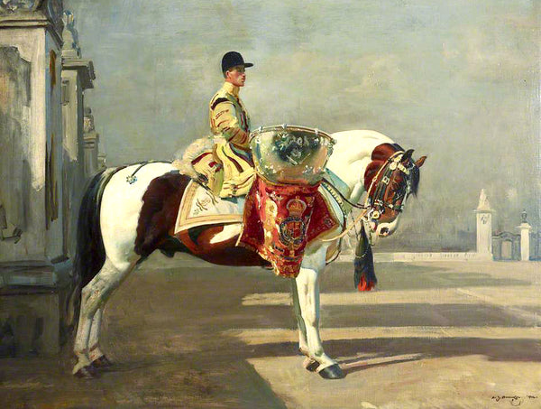 A Fine Lithograph on Stretched Canvas in an Ornate Rococo Frame, "The Drummer of His Majesty’s First Life Guards" after the original painting by Sir Alfred Munnings. The Lithograph measures 16 inches x 12 inches with overall measurements in the Gilt Gesso Gallery frame at 22 inches x 18 inches. The Lithograph has a hand applied varnished finish which replicates the appearance, craquelure, patina & texture of an oil painting. Each Lithograph is a master-piece in its own right and carefully hand-finished to recreate the timeless look and appeal of an original Oil Painting.
