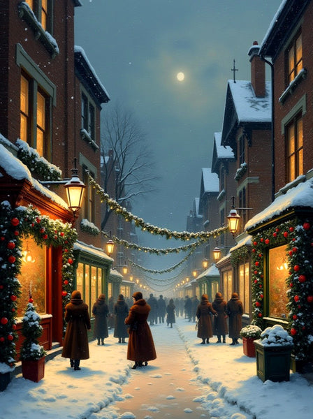 Ornate Framed Lithograph on Canvas of a Edwardian Christmas Snowy Twilight Street Scene