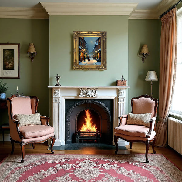 An Exquisite Lithograph on Stretched Canvas in an Ornate Hand Finished Rococo Frame, depicting an Edwardian Christmas Snowy Winters Twilight Street Scene. The Lithograph measures 16 inches x 12 inches with overall measurements in the frame being 22 inches x 18 inches. The Lithograph has a hand applied varnished finish which replicates the appearance, craquelure, patina & texture of an oil painting. Each Lithograph is a master-piece in its own right and carefully hand-finished to recreate the timeless look and appeal of an original Oil Painting.
