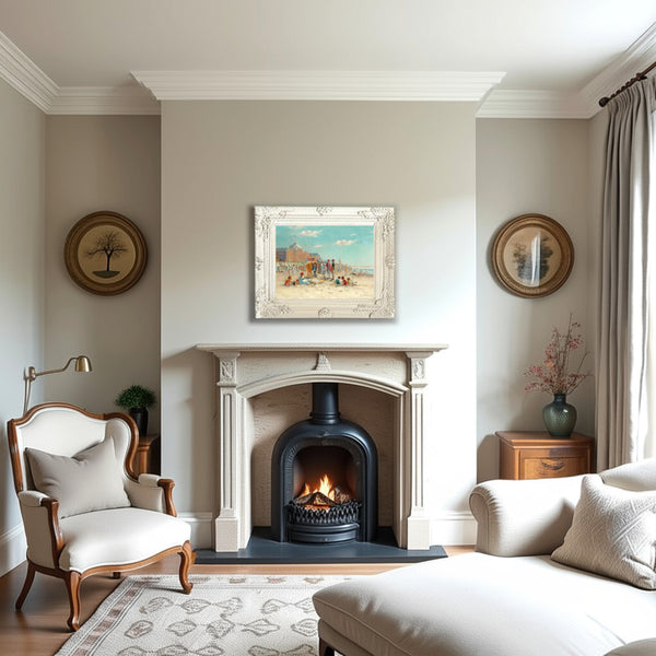 A Fine Oleograph on Stretched Canvas in an Ornate Gilt Gesso Rococo Frame, depicting a beach scene "A Sunny Day at the Beach" after the original by Louis Soonius. The oleograph measures 16 inches x 12 inches with overall measurements in the Gilt Gesso Gallery frame being 21 inches x 17 inches. The Oleograph has a hand applied varnished finish with replicates the appearance, craquelure, patina & texture of an oil painting.