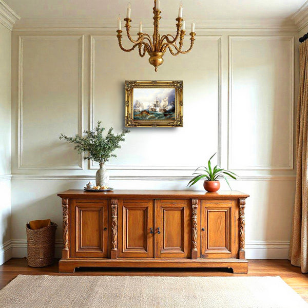 An elegant oleograph on canvas depicting the Battle of Trafalgar 1805 in an ornate Rococo Gilt Gesso Gallery Frame. Measuring 16 inches x 12 inches (22 inches x 18 inches in the frame), the oleograph is handcrafted in Norfolk & has the appearance, patina & texture of an oil painting.