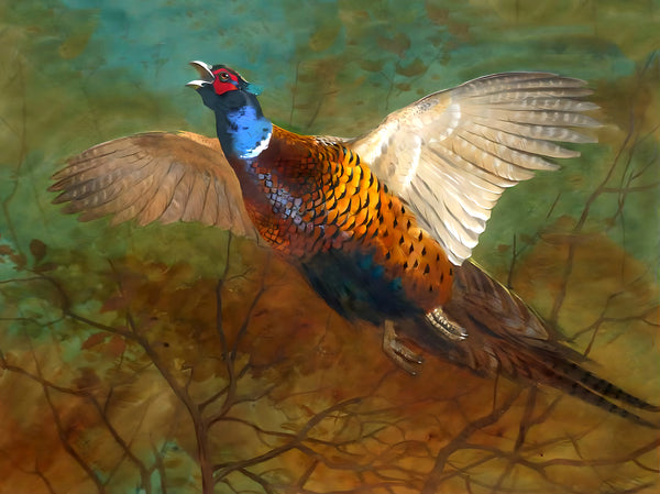 A Very Fine Lithograph on Stretched Canvas in an Ornate Hand Finished Rococo Frame, depicting a Cock Pheasant in Flight after the original by Archibald Thorburn. The Lithograph measures 16 inches x 12 inches with overall measurements in the frame being 22 inches x 18 inches. The Lithograph has the appearance, patina & texture of an oil painting.