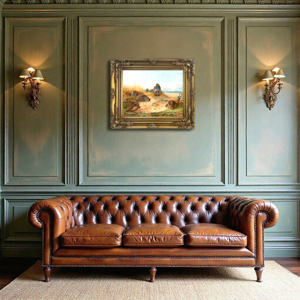 A Beautiful Large Oleograph on Stretched Canvas in an Ornate Hand Finished Rococo Frame, depicting Partridges in a Moorland Landscape. The oleograph measures 16 inches x 12 inches with overall measurements in the frame being 22 inches x 18 inches. The oleograph has the appearance, patina & texture of an oil painting.