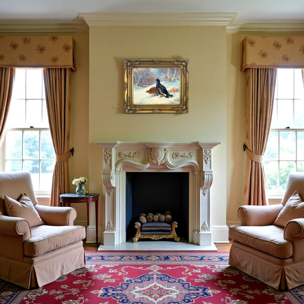 A Beautiful Large Oleograph on Stretched Canvas in an Ornate Hand Finished Rococo Frame, depicting Black Game in Winter after the original by Archibald Thorburn. The oleograph measures 16 inches x 12 inches with overall measurements in the frame being 22 inches x 18 inches. The Oleograph has a hand applied varnished finish which replicates the appearance, craquelure, patina & texture of an oil painting. Each Oleograph is a master-piece in its own right and carefully hand-finished to recreate the timeless look and appeal of an original Oil Painting.