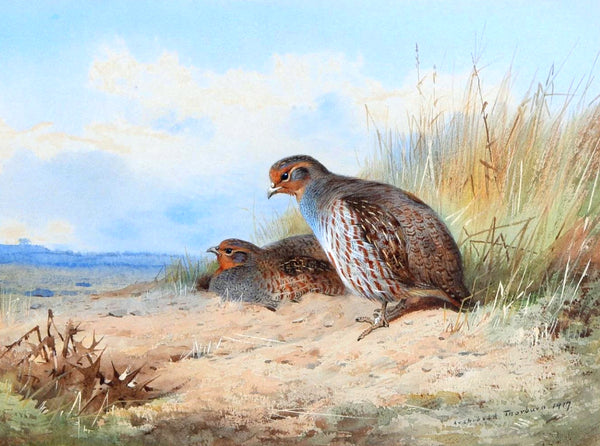A Beautiful Large Oleograph on Stretched Canvas in an Ornate Hand Finished Rococo Frame, depicting a Grey Partridge in an extensive Moorland Landscape. The oleograph measures 16 inches x 12 inches with overall measurements in the frame being 22 inches x 18 inches. The oleograph has the appearance, patina & texture of an oil painting.