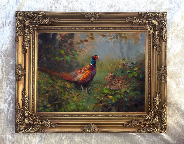 A Very Fine Lithograph on Stretched Canvas in an Ornate Hand Finished Rococo Frame, depicting a Cock & Hen Pheasant in a Copse after the original by Archibald Thorburn. The Lithograph measures 16 inches x 12 inches with overall measurements in the frame being 22 inches x 18 inches. The Lithograph has the appearance, patina & texture of an oil painting.