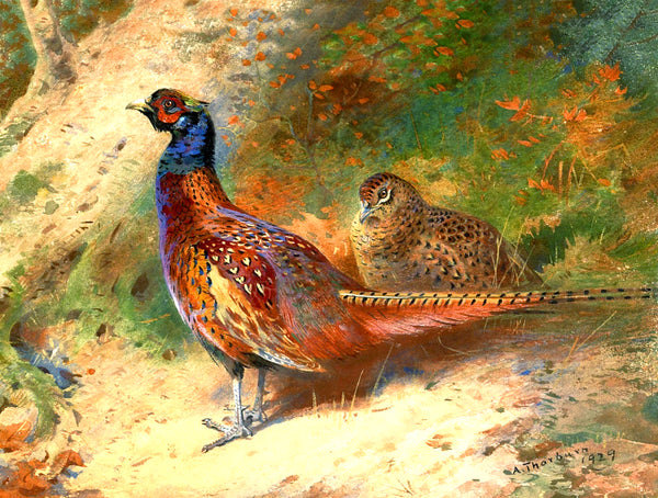 A Very Fine Lithograph on Stretched Canvas in an Ornate Hand Finished Rococo Frame, depicting a Cock & Hen Pheasant in a Thicket after the original by Archibald Thorburn. The Lithograph measures 16 inches x 12 inches with overall measurements in the frame being 22 inches x 18 inches. The Lithograph has the appearance, patina & texture of an oil painting.
