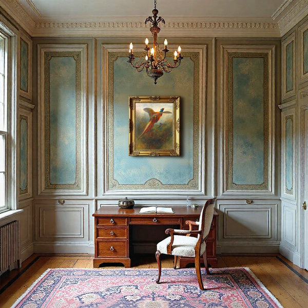 A Very Fine Lithograph on Stretched Canvas in an Ornate Hand Finished Rococo Frame, depicting "A Cock Pheasant Breaking Cover" after the original by Charles Whymper. The Lithograph measures 16 inches x 12 inches with overall measurements in the frame being 22 inches x 18 inches. The Lithograph has the appearance, patina & texture of an oil painting.