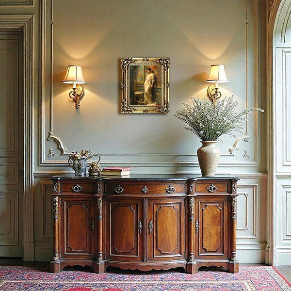 A Very Fine Oleograph on Stretched Canvas in an Ornate Hand Finished Rococo Frame, depicting an Elegant Lady in her Boudoir. The oleograph measures 16 inches x 12 inches with overall measurements in the frame being 22 inches x 18 inches. The Oleograph has a hand applied varnished finish which replicates the appearance, craquelure, patina & texture of an oil painting. Each Oleograph is a master-piece in its own right and carefully hand-finished to recreate the timeless look and appeal of an original Oil Painting.