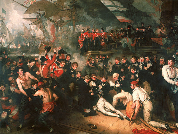 A Very Fine Oleograph on Stretched Canvas in an Ornate Hand Finished Rococo Frame, depicting "The Death of Nelson" after the original by Benjamin West. The oleograph measures 16 inches x 12 inches with overall measurements in the frame being 22 inches x 18 inches. The oleograph has the appearance, patina & texture of an oil painting.