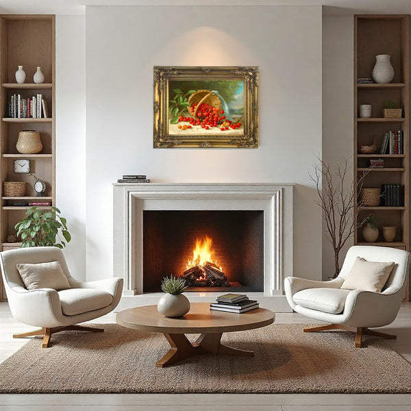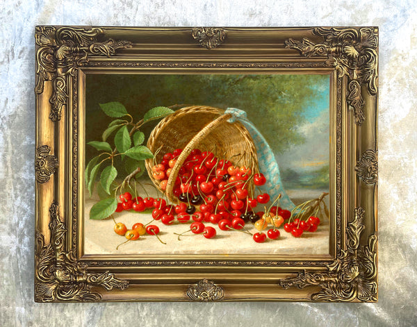 An Exquisite Still Life Oleograph on Stretched Canvas in a stunning highly Ornate Hand Finished Rococo Frame, depicting Cherries in a Basket. The oleograph measures 16 inches x 12 inches with overall measurements in the frame being 22 inches x 18 inches. The oleograph has the appearance, patina & texture of an oil painting.