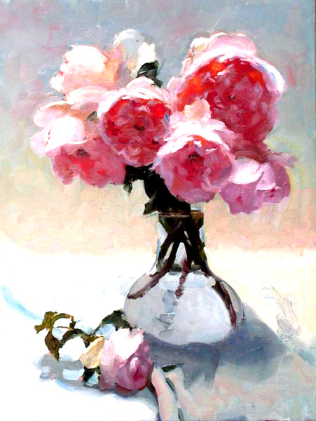 An Exquisite Still Life Oleograph on Stretched Canvas in an Ornate Hand Finished Antique White Gesso Rococo Frame, depicting Pink Roses in a Glass Vase. The oleograph measures 16 inches x 12 inches with overall measurements in the frame being 22 inches x 18 inches. The Oleograph has a hand applied varnished finish which replicates the appearance, craquelure, patina & texture of an oil painting. Each Oleograph is a master-piece in its own right and carefully hand-finished to recreate the timeless look and appeal of an original Oil Painting.