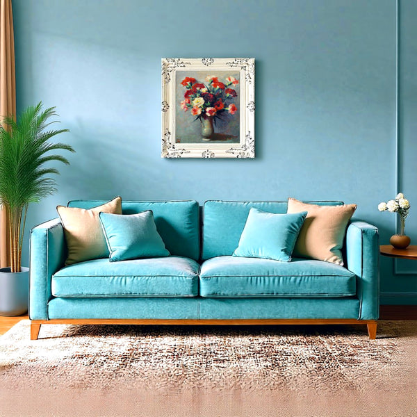 An Exquisite Still Life Oleograph on Stretched Canvas in a Distressed Limewashed White Gesso Rococo Frame, depicting Carnations in a Vase. The oleograph measures at 16 inches x 12 inches with overall measurements in the frame at 22 inches x 18 inches. The Oleograph has a hand applied varnished finish which replicates the appearance, craquelure, patina & texture of an oil painting. Each Oleograph is a master-piece in its own right and carefully hand-finished to recreate the timeless look and appeal of an original Oil Painting.