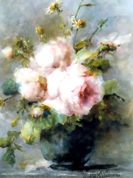 Exquisite Still Life Oleograph on Canvas Still Life of Roses in a Glass Vase
