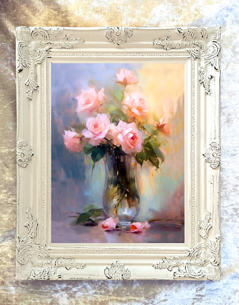 A Stunning Still Life Oleograph on Stretched Canvas in an Ornate Hand Finished Antique White Gesso Rococo Frame, depicting Pink & Yellow Roses in a Glass Vase. The oleograph measures 16 inches x 12 inches with overall measurements in the frame being 22 inches x 18 inches. The oleograph has the appearance, patina & texture of an oil painting.