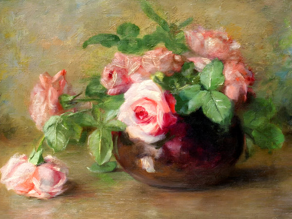 An Exquisite Still Life Lithograph on Stretched Canvas in a stunning highly Ornate Hand Finished Rococo Frame, depicting Pink & White Roses in a Bowl. The Lithograph measures 16 inches x 12 inches with overall measurements in the frame being 22 inches x 18 inches. The Lithograph has the appearance, patina & texture of an oil painting.