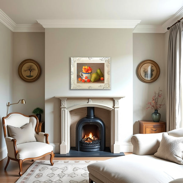 An Exquisite Still Life Oleograph on Stretched Canvas in an Ornate antique white Gesso Rococo Frame, depicting a Porcelain Mug with Cherries & Pears. The oleograph measures at 16 inches x 12 inches with overall measurements in the frame at 22 inches x 18 inches. The oleograph has the appearance, patina & texture of an oil painting.