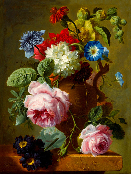 An Exquisite Still Life Oleograph on Stretched Canvas in an Ornate Hand Finished Gilt Gesso Rococo Frame, depicting Assorted Flowers in a Venetian Urn. The oleograph measures 16 inches x 12 inches with overall measurements in the frame being 22 inches x 18 inches. The Oleograph has a hand applied varnished finish which replicates the appearance, craquelure, patina & texture of an oil painting. Each Oleograph is a master-piece in its own right and carefully hand-finished to recreate the timeless look and appeal of an original Oil Painting.