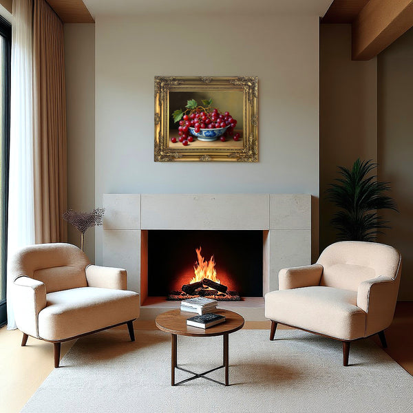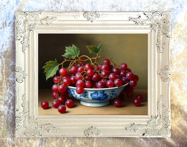 An Exquisite Still Life Oleograph on Stretched Canvas in an Ornate Hand Finished Farrow and Ball antique white Rococo Frame, depicting Grapes in a Blue and White Chinese Bowl. The oleograph measures 16 inches x 12 inches with overall measurements in the frame being 22 inches x 18 inches. The Oleograph has a hand applied varnished finish which replicates the appearance, craquelure, patina and texture of an oil painting. Each Oleograph is a master-piece in its own right and carefully hand-finished to recreate the timeless look and appeal of an original Oil Painting.