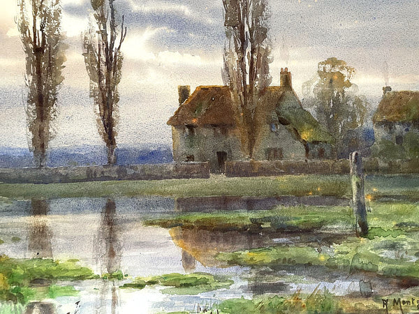 A Beautiful Early C20th Antique Watercolour depicting a Rural Cottage in a Meadow at Twilight by the listed artist Alswen Montgomerie. Dating to the period 1910-1920, the painting measures 20 inches x 16 inches & is elegantly framed in an ornate Rococo Gilt Gesso Gallery Frame with overall measurements being 26 inches x 22 inches. The painting is in excellent condition & is signed by the artist (lower right).