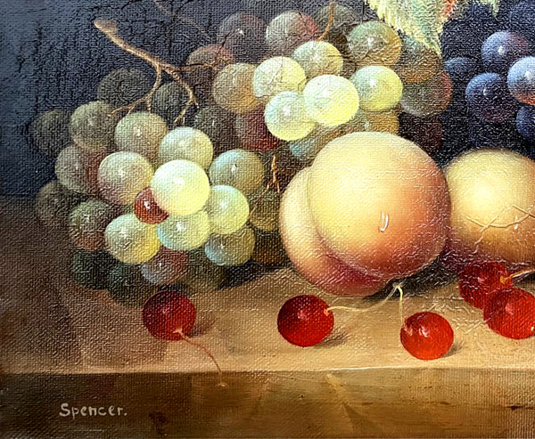 A Beautiful Mid C20th Vintage Still Life Oil on Canvas Board depicting Mixed Fruit on a Ledge. This beautiful English School Still Life Painting measures 10 inches x 8 inches & is elegantly framed in an ornate Rococo Ebonised Wood & Plaster Frame with Gilt decoration. Overall measurements in the frame are 15 inches x 13 inches. The painting is in good condition with no losses & is signed "Spencer" (lower left).